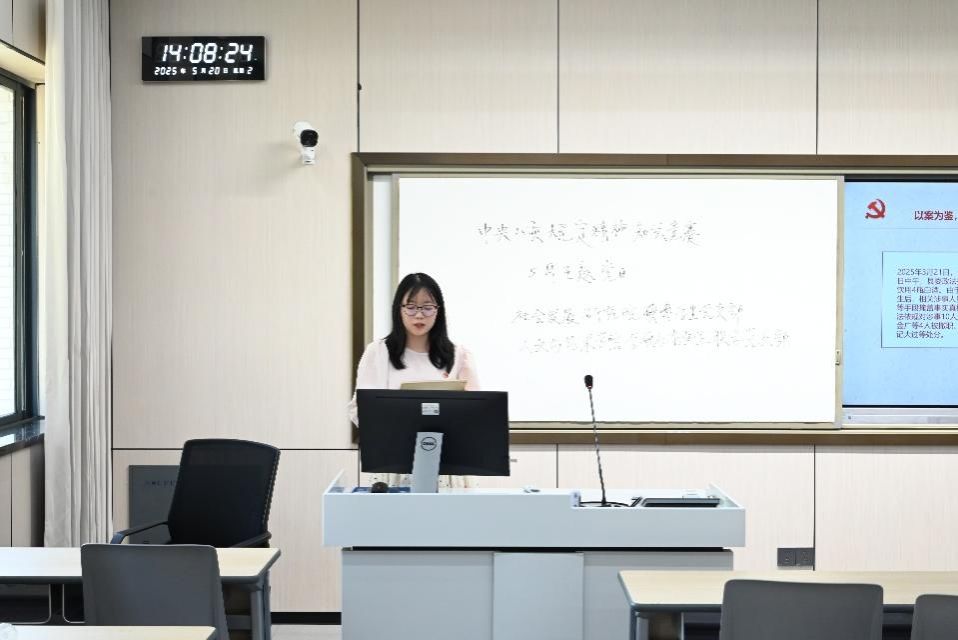 学硕与本科生联合党支部纪检委员)带领大家学习《党的十八大以来深入贯彻中央八项规定精神的成效和经验》和《八项规定改变中国》的主要内容,并分享了题为《以“徙木立信”践行人民立场,以“久久为功”锤炼优良作风》的学习心得。她强调,青年党员要以中央八项规定为标尺,校正自己的思想行为,要在实践中练就“为民情怀”,要将纪律规矩内化于心、外化于行。