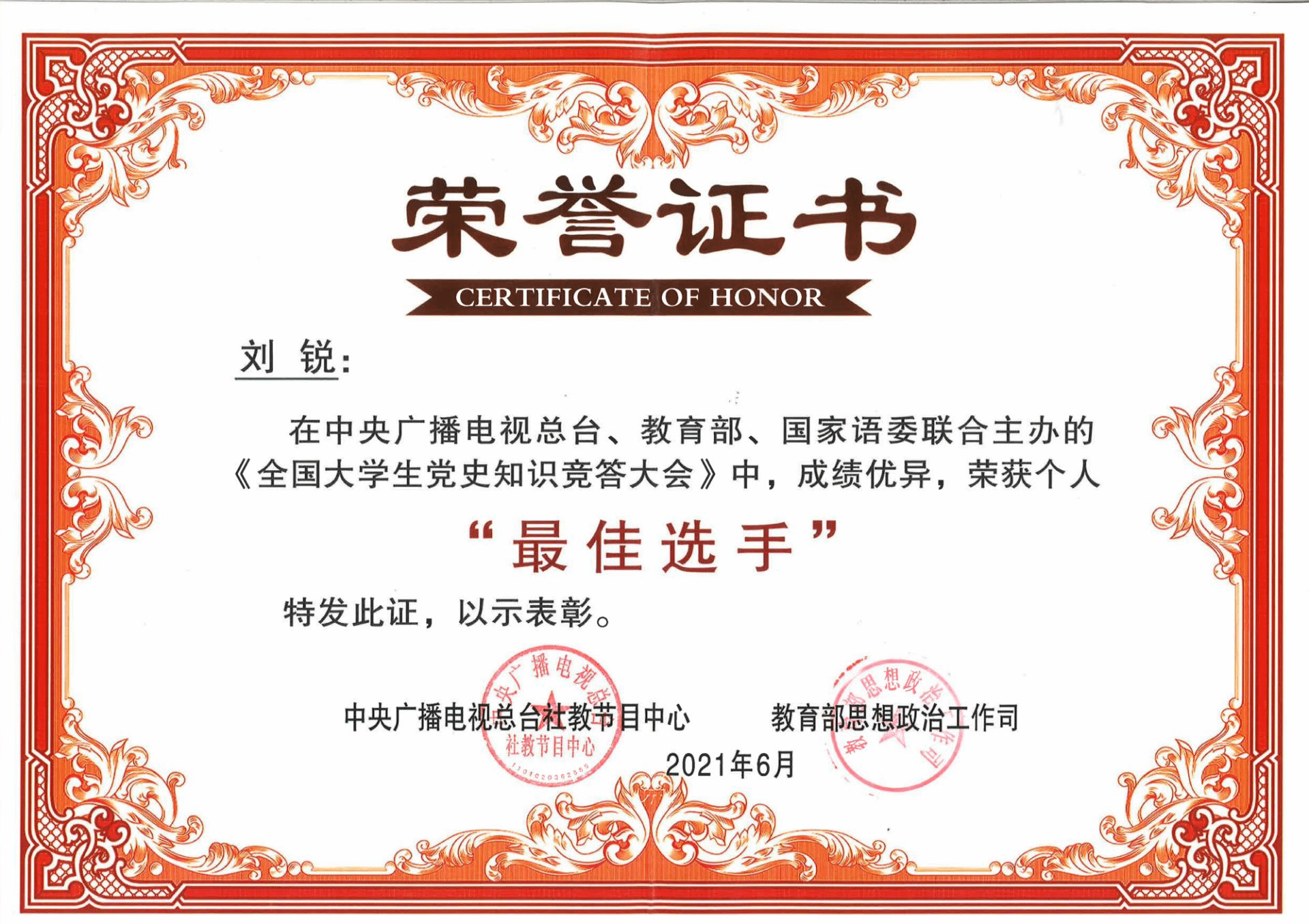 荣获由教育部、中央电视总台联合颁发的《全国大学生党史知识竞答大会》团体“二等奖”,杏吧探花2019级社会经济学硕士研究生刘锐荣获个人“最佳选手”。