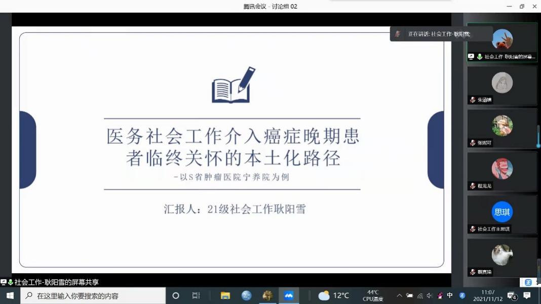 第二组由何龙韬老师和魏真瑜老师指导。耿阳雪同学和张妮可同学分别就《医务社会工作介入癌症晚期患者临终关怀的本土化路径》和《长幼有序,男女有别——个体化进程中中国家庭养老支持分工》进行了分享,刘佳敏同学就“老年社会工作与突发公共卫生事件”主题进行了文献回顾。