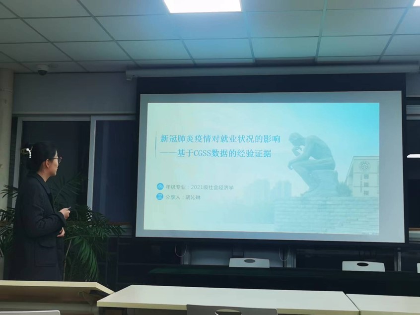随后,胡沁琳同学展示了其毕业论文《新冠肺炎疫情对就业状况的影响——基于CGSS数据的经验证据》。该研究根据研三毕业生找工作的实际情况,探讨新冠肺炎疫情对就业的影响。在场下同学们的热情邀请下,胡沁琳同学还向学弟学妹们分享了自己找工作的经验,鼓励大家提高综合素质,多多参与学生活动,早日确定好读博、考公、就业的目标,切莫到了毕业季胡乱地几手抓。