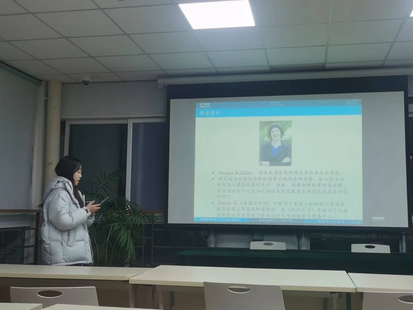 李沁雨同学紧接着展示了《金钱的工作意义》的读书报告。不同于传统经济学家将金钱全然看作无差别的一般等价物,此书认为金钱往来与社会关系实际上是非常复杂的相互影响的关系,李沁雨同学旁征博引,着重介绍了家庭内部、礼物流动、慈善救济三个领域中的“金钱”的社会意义。