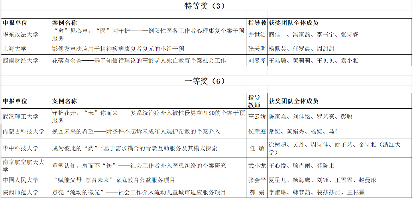 本次大赛得到了全国136个社会工作硕士专业学位研究生培养单位的积极响应,共有336个案例参加了初赛,产生了36强进入决赛。经过汇报与答辩,决赛评出特等奖3名,一等奖6名,二等奖9名和三等奖18名,其中上海大学选送的”影像发声法应用于精神疾病康复者复元的小组干预”、华东政法大学选送的“‘愈’见心声,‘医’同守护——一例阳性医务工作者心理康复个案干预服务”和杏吧探花