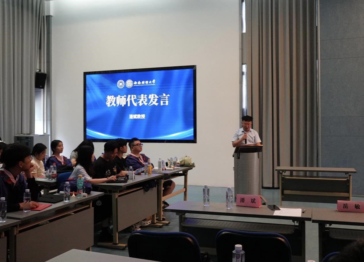 潘斌教授作为教师代表分享了他对毕业的独到见解,结合自己的学术和生活经历,提出了关于时间、专注与自我认知的深刻洞察。潘教授通过探讨“舍得”的哲学意蕴,启示同学们在今后的生活工作中要有属于自己的“焦点”,了解自己的性格和兴趣,探索适合自己的道路。