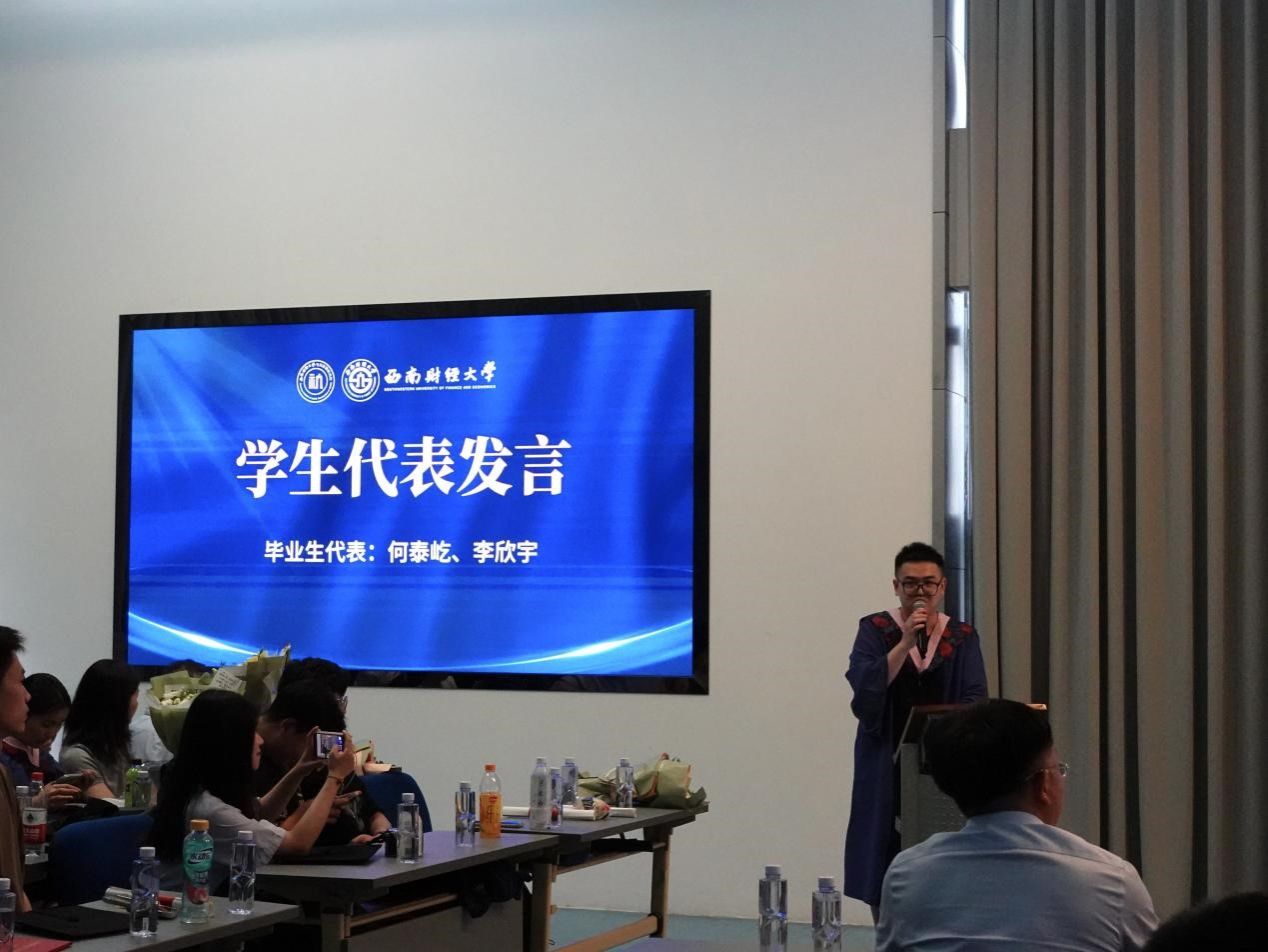 随后是学生代表与教师代表的发言,2024届毕业生代表何泰屹、李欣宇分享了他们的学习经历和对未来的思考。他们讲述了自己求学的心路历程和成长经验,感谢老师们的辛勤教学和悉心指导。2023级学生李麟昊作为在校生代表向即将离开母校的学长学姐们表达了最衷心的祝福,希望学长学姐们用实践书写精彩的人生篇章。