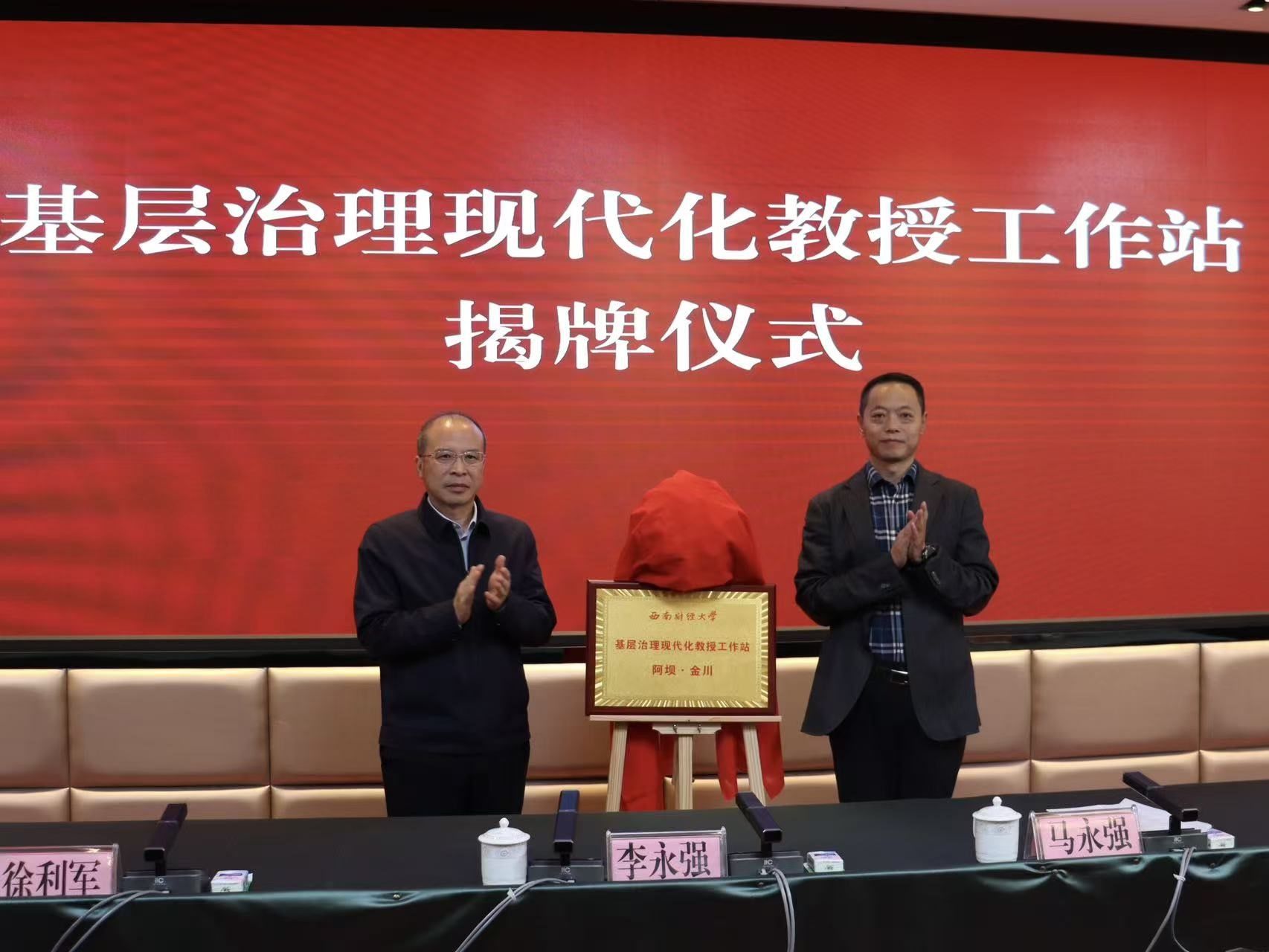 党委书记岳敏、社会工作专业师生代表,金川县委副书记、县长史志刚,县委常委、县委办主任余璐,副县长叶枫,社会工作部等县级相关部门负责人参加。李永强和史志刚共同为基层治理现代化教授工作站授牌。