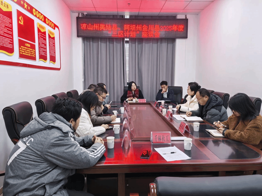 其后,团队在美姑县委社会工作部会议室召开了“凉山州美姑县、阿坝州金川县2025年度‘三区计划’座谈会。美姑县委社会工作部副部长曲比石达首先对美姑县情及部门工作开展情况进行了简要汇报,随后美姑县委社会工作部和金川县委社会工作部分别就两县社会工作事业发展情况作了汇报,四川光华社会工作服务中心、美姑千林社会工作服务中心分别就“三区计划”实施情况进行了汇报;李财权针对“三区计划”下一步工作设想进行了详细阐述,并引导与会人员针对调研中发现的具体问题、潜在的合作切入点、本土社工人才培养、资源整合路径等进行了热烈交流讨论。讨论期间产出了众多包括“建立县域社会工作发展阵地”“着力推动成都等地的优质社工资源逐步向两地延伸”等建设性意见。
